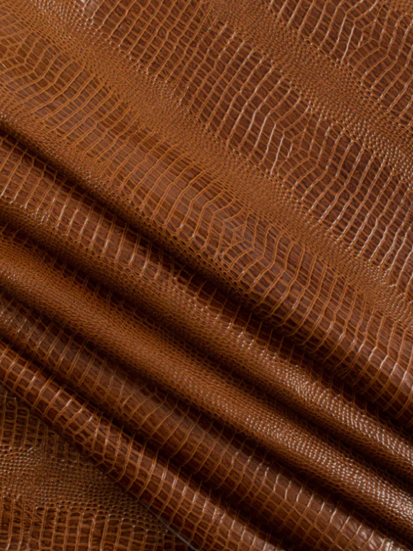 Embossed top grain cowhide in repeating belly print of crocodile. Aniline color top applied, hand antiqued effect with a glazed finish.