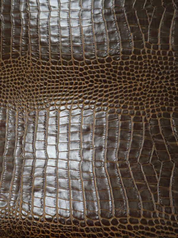 Embossed top grain cowhide in repeating belly print of crocodile. Aniline color top applied, hand antiqued effect with a glazed finish.
