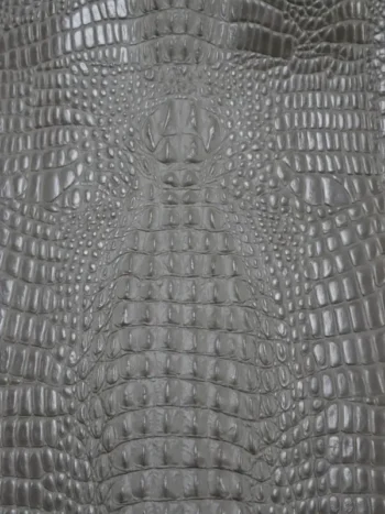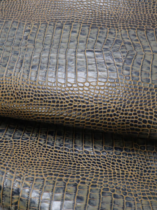 Embossed top grain cowhide in repeating belly print of crocodile. Aniline color top applied, hand antiqued effect with a glazed finish.