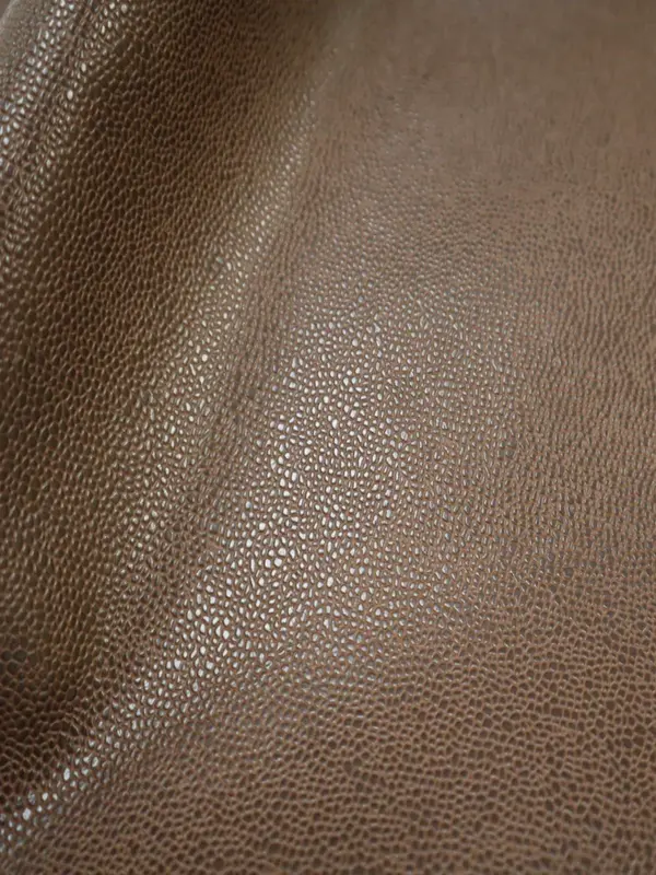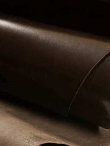 Embossed top grain cowhide in uniform small bumpy texture like a basketball. Aniline drum dyed through base color, hand tipped for shine on top of leather.