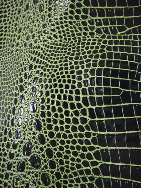 Embossed top grain cowhide in repeating belly to side of crocodile. Aniline drum dyed crust and aniline bright underlay colors, with hand tipped top color top finish.