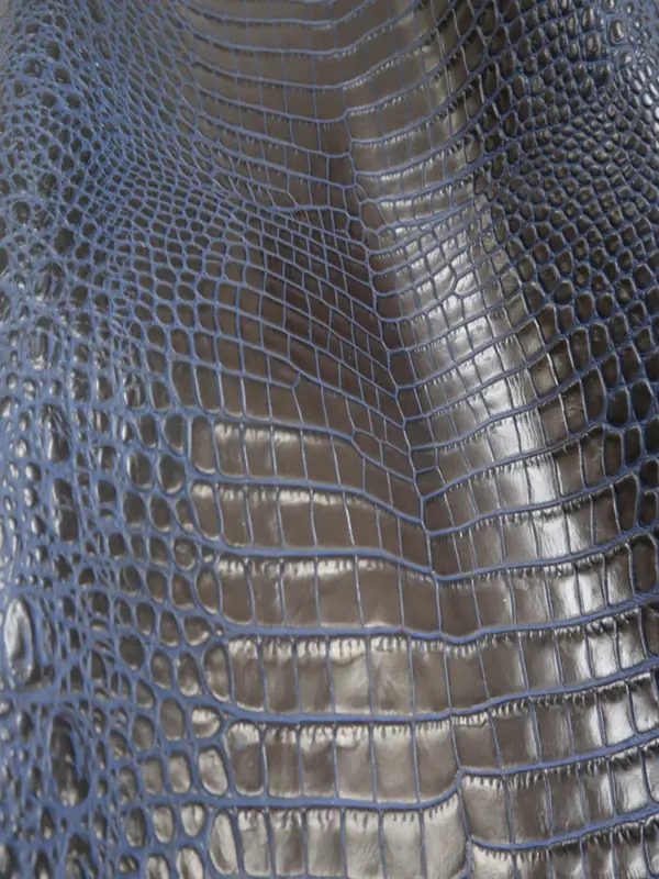 Embossed top grain cowhide in repeating belly to side of crocodile. Aniline drum dyed crust and aniline bright underlay colors, with hand tipped top color top finish.
