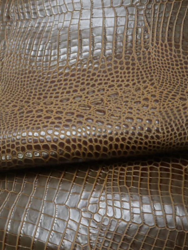Embossed top grain cowhide in repeating belly to side of crocodile. Aniline drum dyed crust and aniline bright underlay colors, with hand tipped top color top finish.