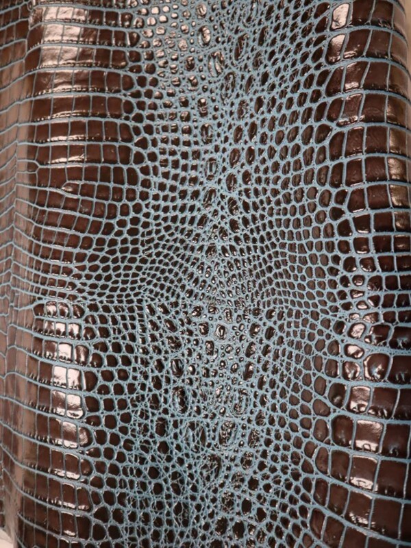 Embossed top grain cowhide in repeating belly to side of crocodile. Aniline drum dyed crust and aniline bright underlay colors, with hand tipped top color top finish.