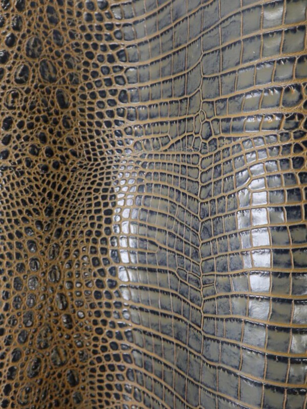 Embossed top grain cowhide in repeating belly to side of crocodile. Aniline drum dyed crust and aniline bright underlay colors, with hand tipped top color top finish.