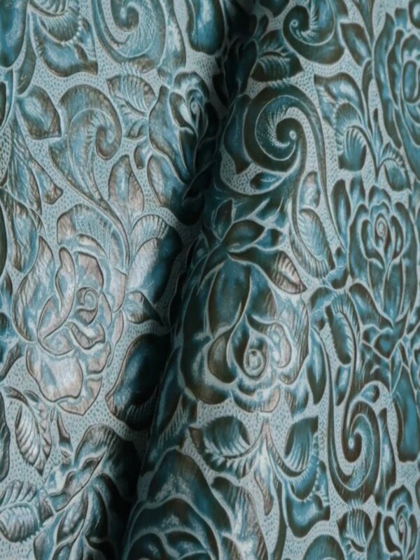 Embossed top grain cowhide in uniform large rose petal design. Hand applied aniline dyes in multi color combinations.