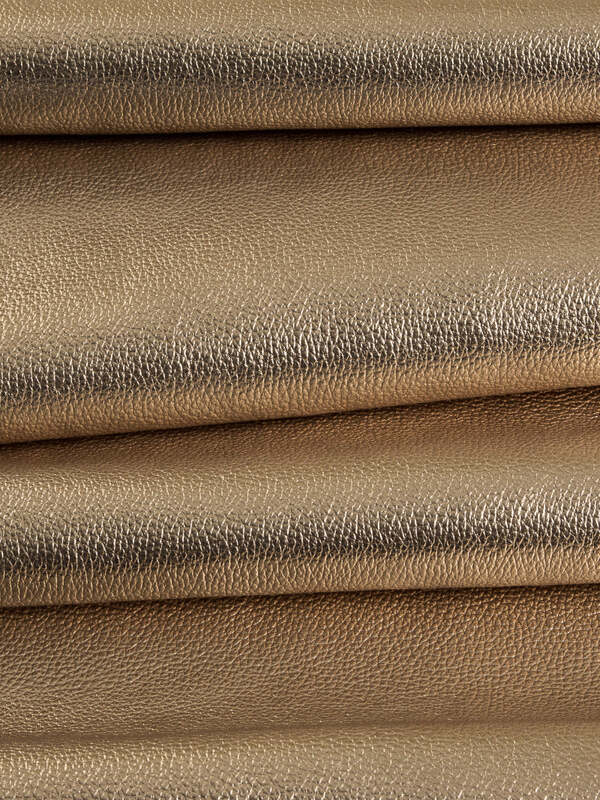 Embossed top grain cowhide made with metallic foil top finish, aniline drum dyed through crust, milled for a floater pebble effect. Soft temper and smooth hand feel.