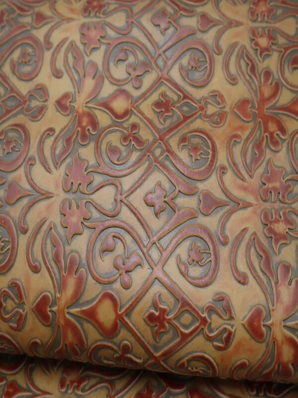 Embossed top grain cowhide in unform paisley design, hand antiqued aniline dyes, drum dyed through base crust.