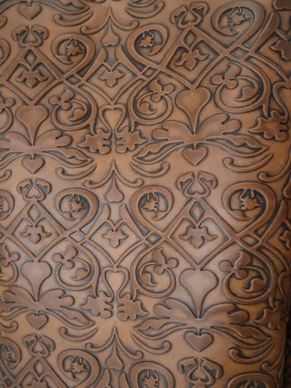 Embossed top grain cowhide in unform paisley design, hand antiqued aniline dyes, drum dyed through base crust.