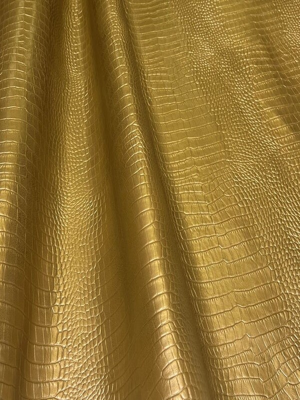 Embossed top grain cowhide in repeating belly print of crocodile. Utilizing a spray finish metallic as opposed to the typical foil to create a stronger adhesion and longevity to our leather.
