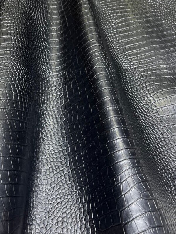 Embossed top grain cowhide in repeating belly print of crocodile. Utilizing a spray finish metallic as opposed to the typical foil to create a stronger adhesion and longevity to our leather.