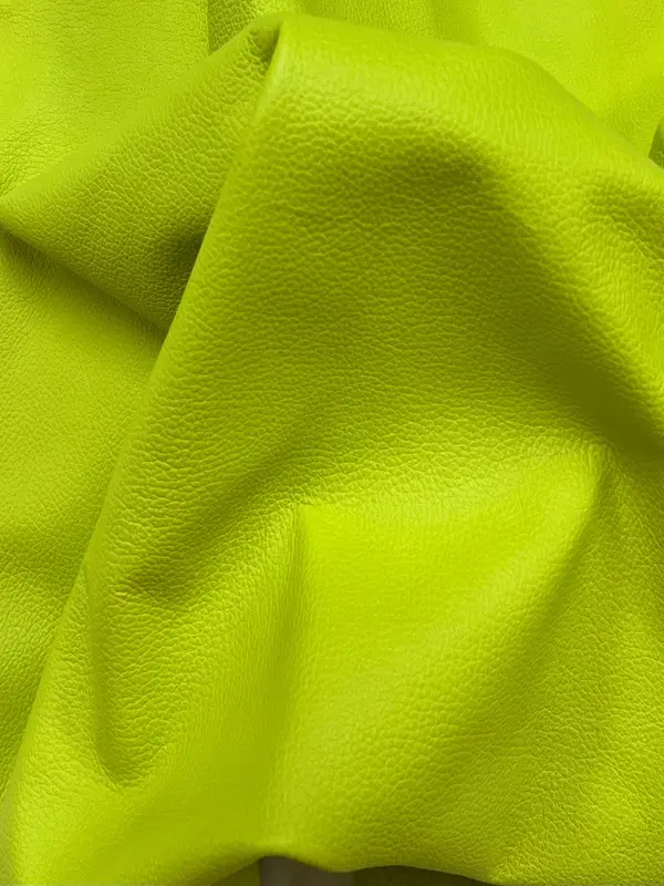 Embossed top grain cowhide in uniform pebble print. Aniline drum dyed to color, top finished with semi pigmented/semi aniline dye in neon bright color. Milled for a soft temper.