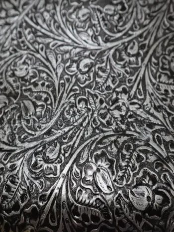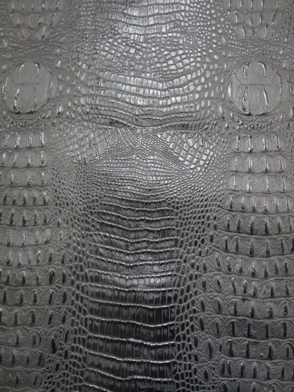 Embossed top grain cowhide in repeating raised hornback crocodile print. Hand rubbed aniline dye top finish, aniline drum dyed base crust. Soft temper from washing of skins at final.